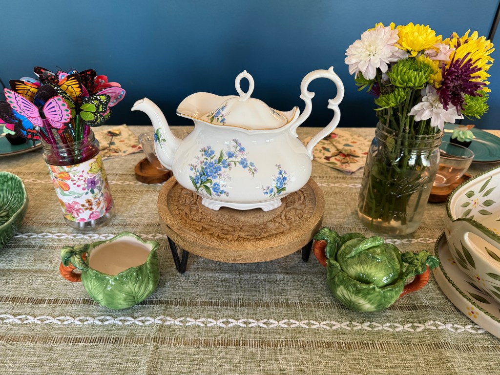 This tea party was one of our “bring a friend” parties! It featured a new (old/vintage) Royal Albert teapot I found at an estate sale as the centerpiece.